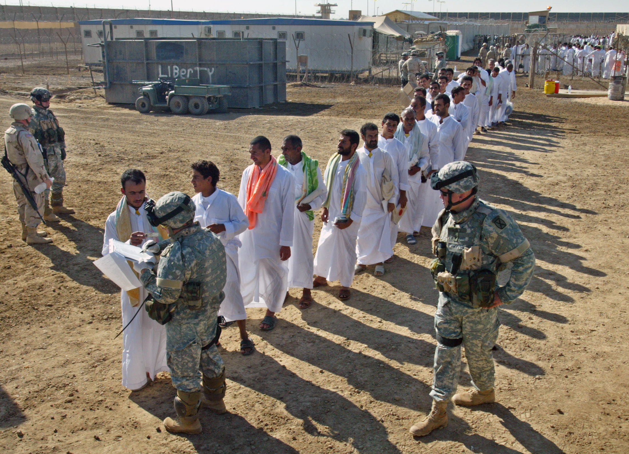 Detainees are checked by U.S. soldiers during a prisoner release at Abu Ghraib prison, 25 km (15 miles) west of Baghdad October 1, 2005. Clutching new Korans and given $25 apiece, about 500 Iraqi prisoners were released from the U.S. military's Abu Ghraib jail on Saturday in a goodwill gesture ahead of the Muslim holy month of Ramadan. REUTERS/Faleh Kheiber
