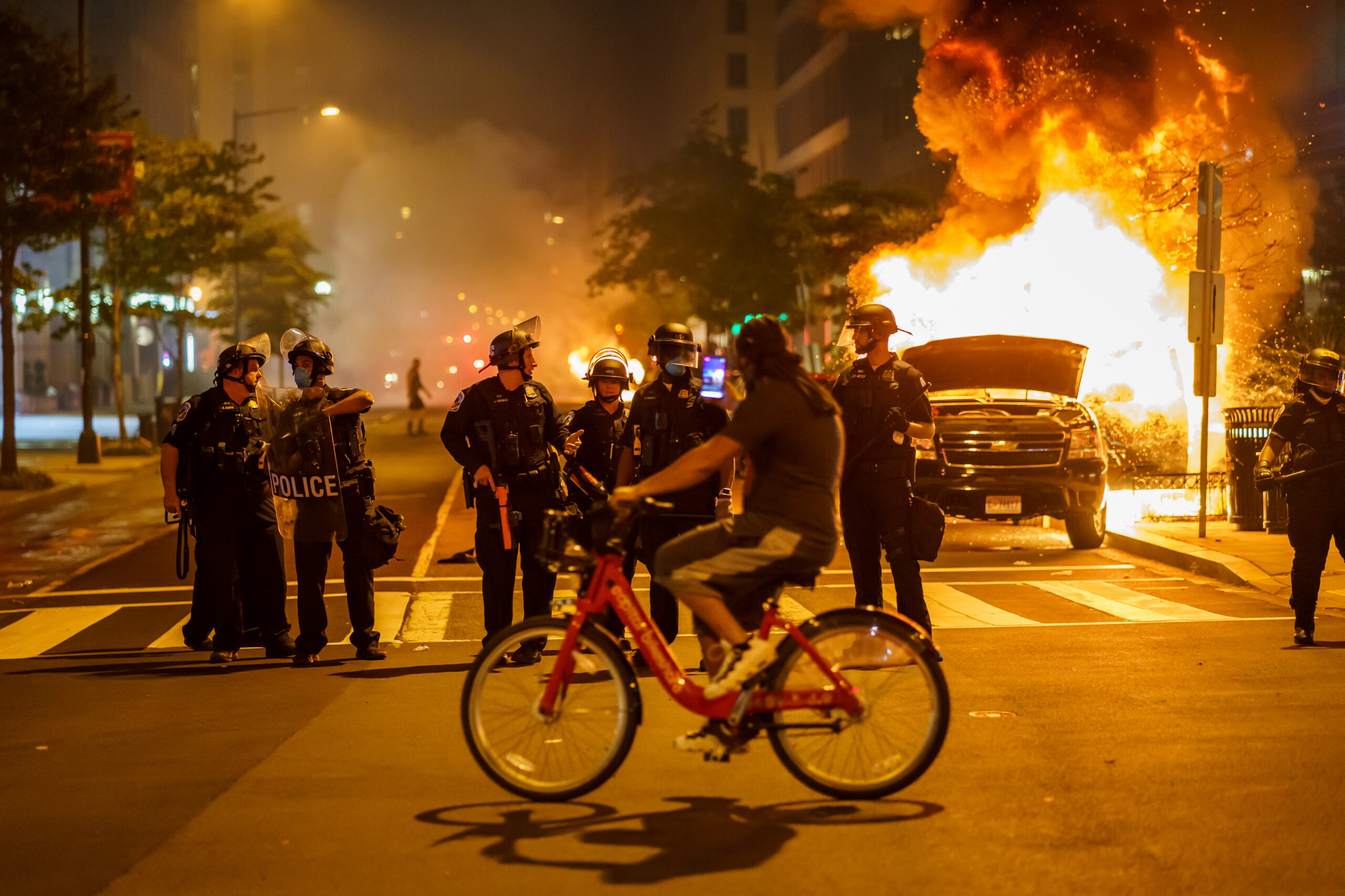 What is under way now, during the Presidency of Donald Trump, is something different. War—its implements, its enmities—pervades civic life. In June, the National Guard deployed to the streets of Washington, D.C., in the face of largely peaceful protests against police brutality and systemic racism, and active-duty troops were stationed outside the city. “You have to dominate,” Trump told the nation’s governors. In July, his Administration sent to Portland, Oregon, paramilitary-style agents who forced people into unmarked cars, predictably causing resistance to swell. The President kicked off September by visiting the scene of police and paramilitary shootings in Kenosha, Wisconsin. After making excuses for Kyle Rittenhouse, his seventeen-year-old supporter charged with using a military-style rifle to commit two homicides, Trump crowed that “all the violence is coming from the left” and is “really domestic terror.” At Tuesday’s debate, asked to condemn white supremacists, Trump appeared to encourage them instead, telling the far-right Proud Boys to “stand back and stand by.”