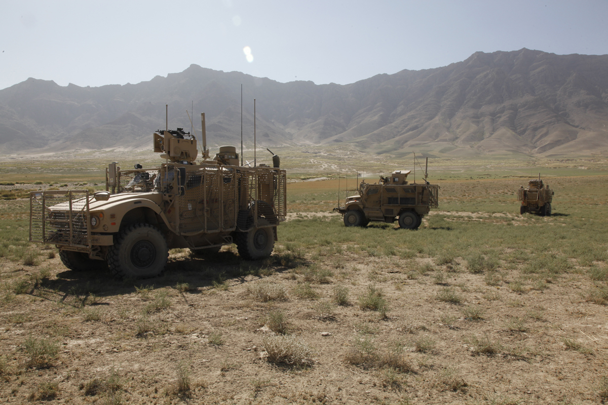 Apache's Red Platoon stages its vehicles during an area recon patrol in the Bagram district Aug. 11, 2014. (Cpl. George Huley/U.S. Army COMCAM)