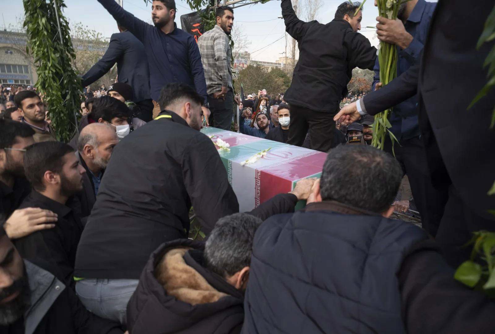 Unidentified men are standing around a coffin containing the body of Faezeh Rahimi, who was killed in attacks in Kerman. The coffin is on a truck during an anniversary ceremony for the former commander of the Islamic Revolutionary Guard Corps' (IRGC) Quds Force, Major General Qassem Soleimani, at the Imam Khomeini Grand Mosque in downtown Tehran after Friday prayers on January 5, 2024. More than 100 mourners who were attending the Soleimani killing anniversary have been killed in two attacks in the city of Kerman. (Photo by Morteza Nikoubazl/NurPhoto)NO USE FRANCE
