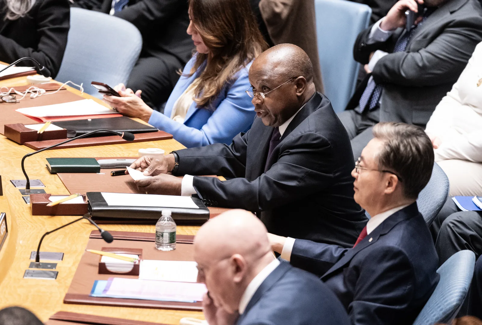 Ambassador Pedro Comissario Afonso of Mozambique speaks during Security Council meeting and voting on resolution on Israel and Gaza conflict at UN Headquarters in New York on March 25, 2024. Resolution was put forward by elected members of Security Council. Resolution was adopted with one vote abstained (the USA). (Photo by Lev Radin/Sipa USA)