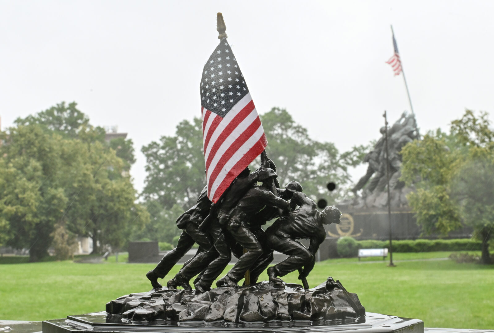 A miniature replica of the U.S. Marine Corps War Memorial is displayed beside the original monument in Arlington, Virginia, United States, on May 28, 2025. (via Reuters)