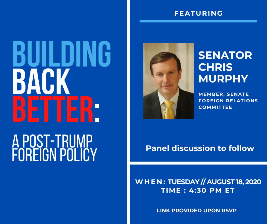 Join Foreign Policy for America, J Street, Quincy Institute, Truman National Security Project, Oxfam America Action Fund, National Security Action, and progressive partners for a conversation featuring keynote speaker Senator Chris Murphy (D-CT) on Tuesday, August 18th from 4:30-6:00 PM ET. In the wake of the disasters of the Trump Administration, a Biden Administration will have an opportunity to build back better: to revitalize American diplomacy as our tool of first resort, restore American leadership and global cooperation to tackle the COVID-19 pandemic and the climate crisis, rebalance our investments to achieve lasting security, and strengthen US commitments to human rights, democracy, and global development. Panelists include: o Sen. Chris Murphy (D-CT) o Amb. Dan Baer, Senior fellow, Carnegie Endowment for International Peace; former U.S. Ambassador to OSCE o Loyce Pace, President and Executive Director, Global Health Council o Carlyn Reichel, Foreign Policy Director, Biden for President o Maggie Thomas, Political Director, Evergreen Project o Moderated by Heather Hurlburt, Director, New Models of Policy Change project, New America’s Political Reform program