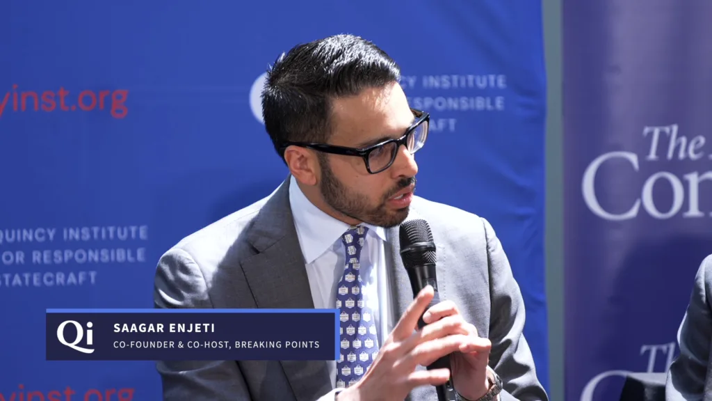 Saagar Enjeti is co-host of the popular political podcast, Breaking Points. Before that he co-hosted The Hill's Rising podcast. He is also a Tony Blankley fellow at the Steamboat Institute. He previously served as media fellow at Hudson Institute, and White House Correspondent for the Daily Caller.