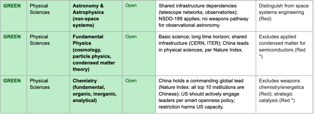China engagement note: Fields where China is the acknowledged global leader (per Nature Index 2024) are flagged. Per the smart openness proposal, the US should actively engage with world leaders in these fields to access and absorb world-class knowledge, consistent with the tier classification.