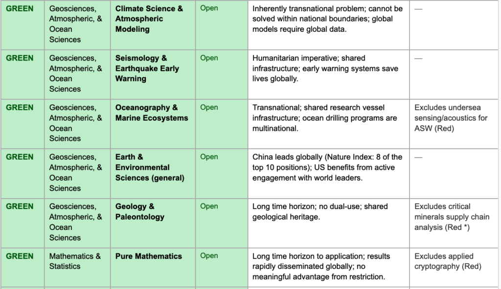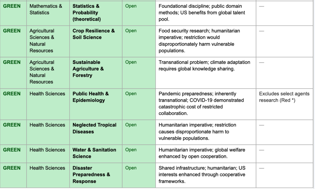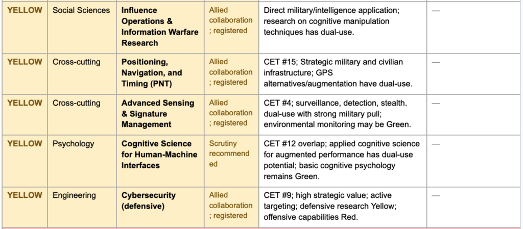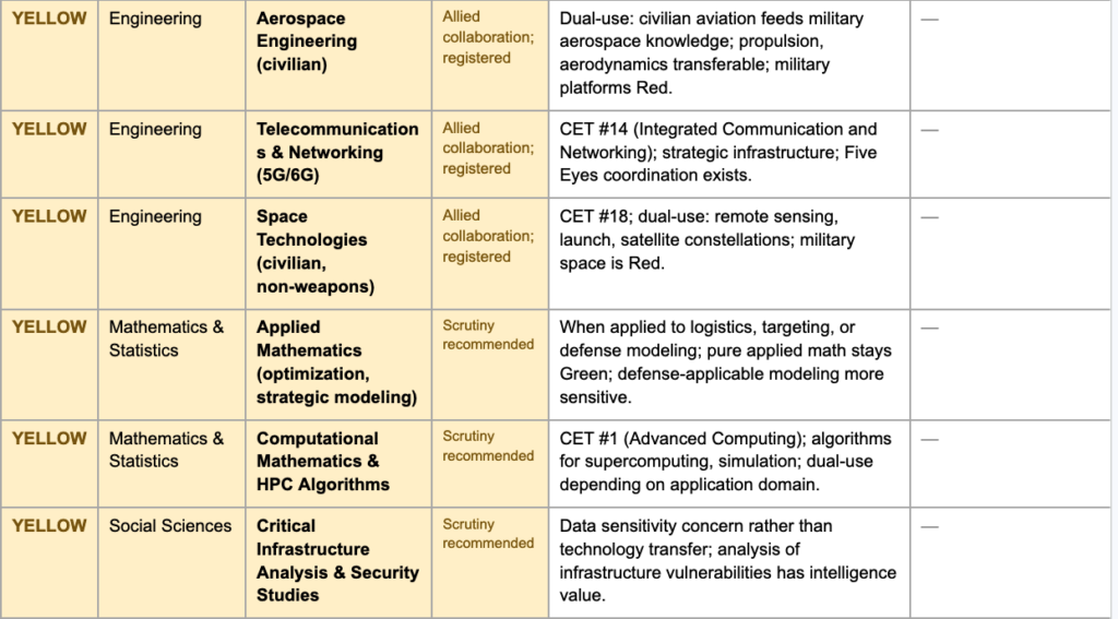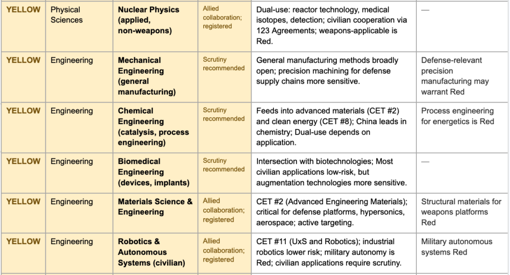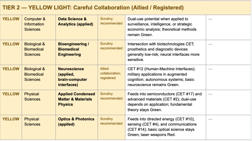 The yellow category creates a structured middle ground for fields that are unclassified but warrant guided consideration — areas where dual-use potential, strategic supply chain concerns, or active foreign targeting elevate risk above baseline without justifying outright prohibition. In these fields, decisions about specific collaborations would be made by institutional research security officers in consultation with relevant government agencies, using standardized criteria rather than ad hoc political judgment. The goal is to make the yellow zone a space of informed flexibility rather than defensive withdrawal.