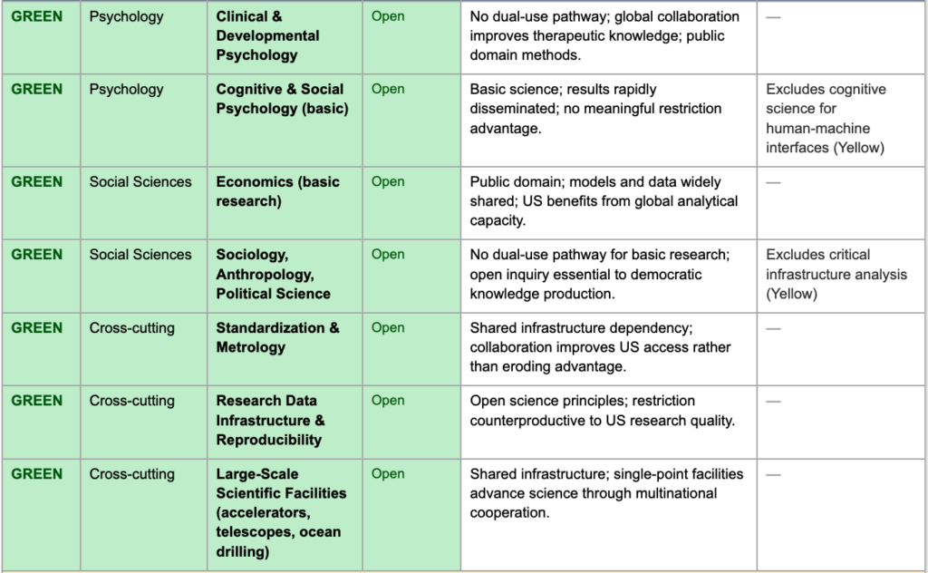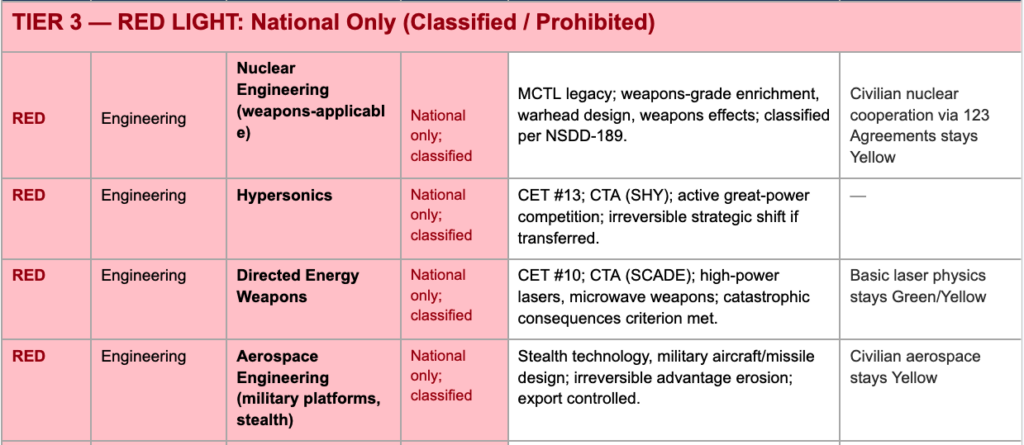 Note on allied scope: The definition of “allied collaboration” in the yellow tier remains to be determined. Options include Five Eyes, Five Eyes and Japan, South Korea, the European Union, and NATO, or a variable grouping depending on the field. This decision fundamentally shapes the practical effect of the yellow tier and should be addressed as a cross-cutting policy question.