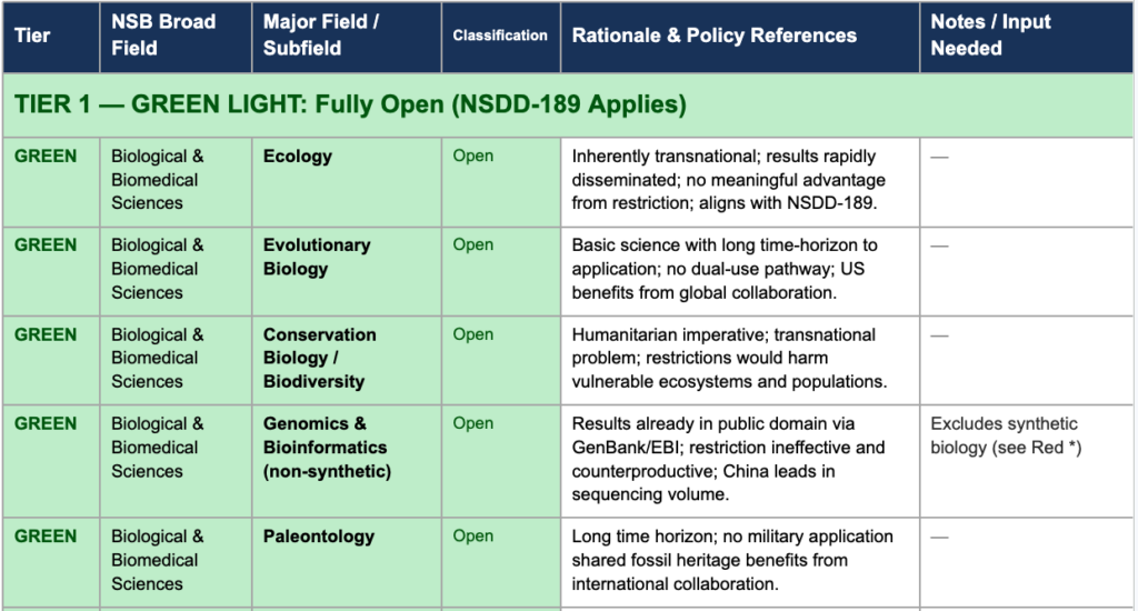 The idea is to categorize these fields into three broad areas: green, yellow, and red. The proposed framework for field determination rests on National Security Decision Directive 189 (1985) — which establishes that fundamental research results should remain unrestricted “to the maximum extent possible” and that “where national security requires control, the mechanism for control is classification” — and the NSDD Federation of American Scientists policy directive on technology transfer.6