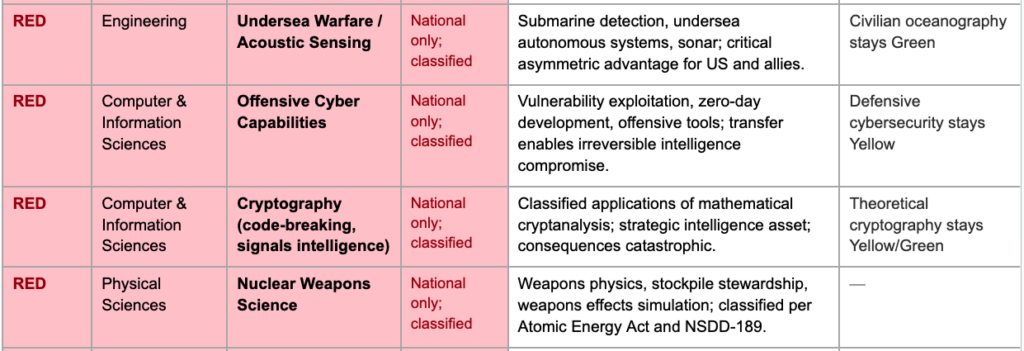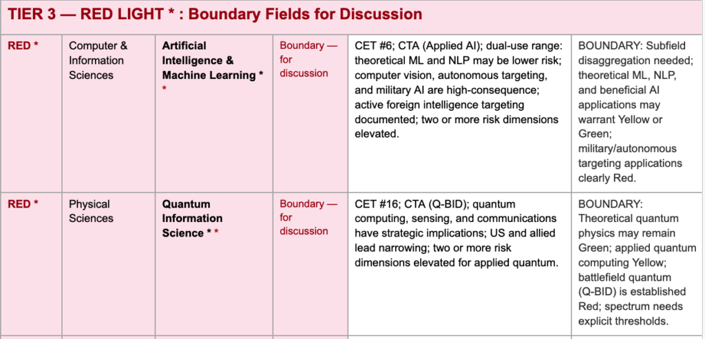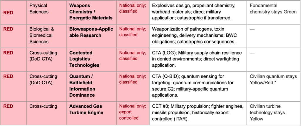 - Artificial Intelligence/Machine Learning*: Spectrum from theoretical ML and natural language processing (potentially yellow/green) through computer vision and autonomous decision systems (yellow) to autonomous targeting and military AI (red). The DoD’s Applied AI CTA covers the red end; the question is where the line falls for dual-use research.