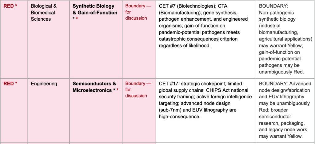 - Synthetic Biology/Gain-of-Function*: Industrial biomanufacturing and agricultural synthetic biology (potentially yellow) vs. gain-of-function on pandemic-potential pathogens (red by catastrophic consequences criterion). The DoD Biomanufacturing CTA straddles this boundary.