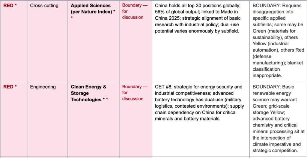 - Applied Sciences (Nature Index category)*: China dominates with 56 percent of global output. This aggregate category spans subfields with vastly different security profiles. Requires disaggregation by a specific applied domain before meaningful classification is possible.