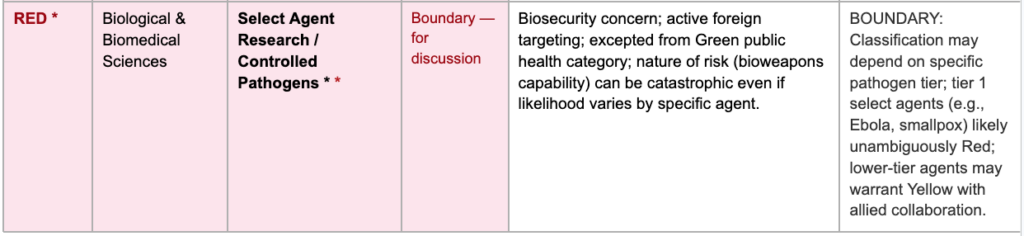 - Select Agent Research/Controlled Pathogens*: Tier 1 select agents (ebola, smallpox, anthrax) likely unambiguously red given catastrophic bioweapons potential. Lower-tier agents with primarily public-health significance may warrant yellow with allied collaboration frameworks. Classification may need to follow the existing CDC/APHIS select agent tiers.
