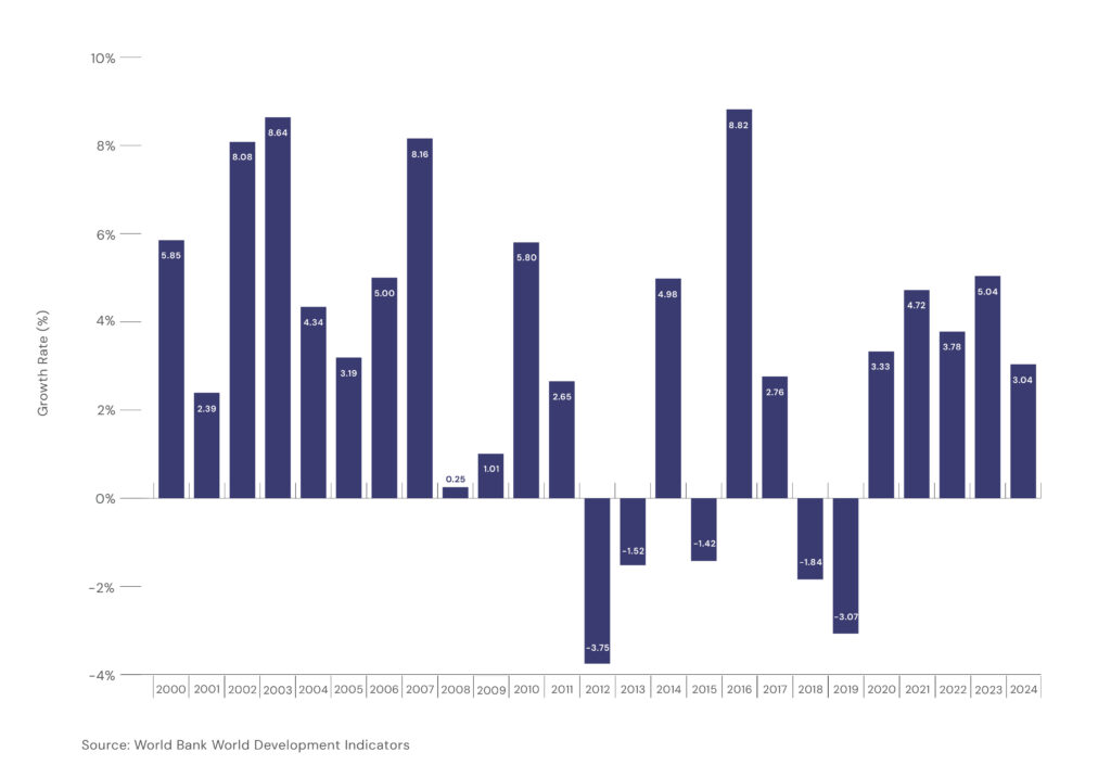 World Bank Group, “GDP Growth (Annual %): Iran, Islamic Rep.,” last updated 2025, https://data.worldbank.org/indicator/NY.GDP.MKTP.KD.ZG?end=2023&locations=IR&start=2010. ↩