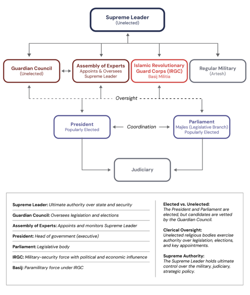 Before the war, this internal architecture was already complex and layered. Iran’s political system combined republican and theocratic elements in a hybrid structure in which elected institutions, including the presidency and parliament, operated alongside unelected bodies dominated by clerical authority. The office of the Supreme Leader stood at the apex of this system, which held ultimate control over key areas of state policy. Power has long been distributed across multiple centers, including political, religious, and security institutions, with the Islamic Revolutionary Guard Corps, the IRGC, playing an increasingly influential role beyond its formal military function. While this arrangement allowed for a degree of political competition, it remained tightly bound by mechanisms designed to preserve the ideological foundations of the Islamic Republic.