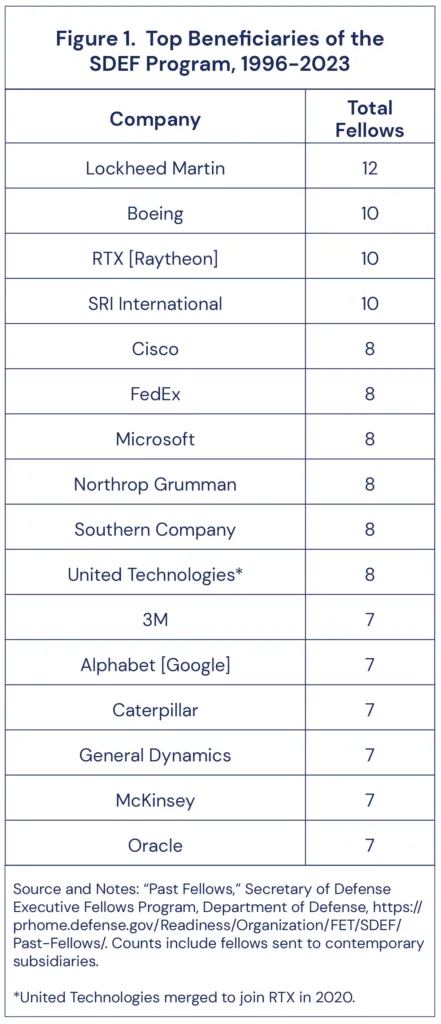 Government contractors, and especially military contractors, benefit disproportionately from the SDEF program. Lockheed Martin and RTX, the world’s two largest defense contractors, are also two of the top beneficiaries of the SDEF program.34In total, 29 percent of all SDEF fellows have gone to the nation’s top 50 government contractors, with 15 percent going to the “big five” military contractors alone.35