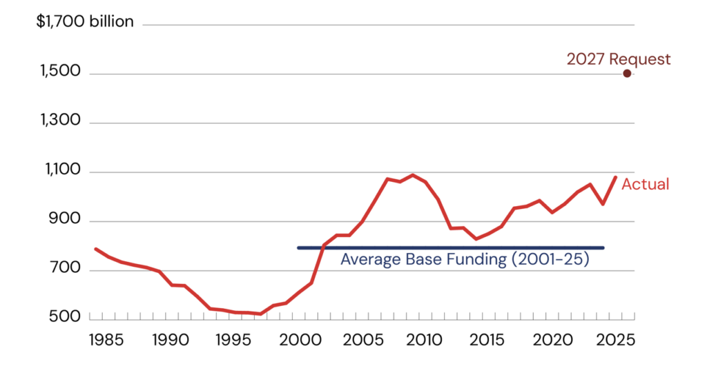 The longer-term plan released by the administration with the 2027 budget request projects Pentagon funding falling back to $1.3 trillion in 2028, with no additional mandatory spending projected. But history strongly suggests that, once spending levels for defense (or most other areas, for that matter) are increased and plans expanded, administrations do not suddenly propose reductions. And certainly the pattern that the Trump administration, in particular, has shown for these past two fiscal years — including a $150 billion defense increase for 2026, a proposed $450 billion defense increase in 2027, and a $200 billion supplemental wartime request — may be taken to suggest that this administration is, if anything, more likely to further increase defense spending beyond $1.5 trillion rather than to preside over some future reduction in spending.