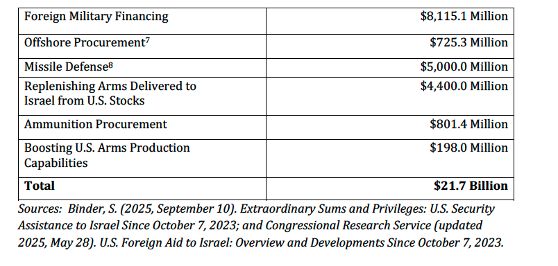 9. Binder, S. (2025, September 10). Extraordinary Sums and Extraordinary Privileges: U.S. Security Assistance to Israel Since October 7, 2023. Middle East Democracy. https://mideastdc.org/publication/extraordinarysums-and-privileges-u-s-security-assistance-to-israel-since-october-7-2023/